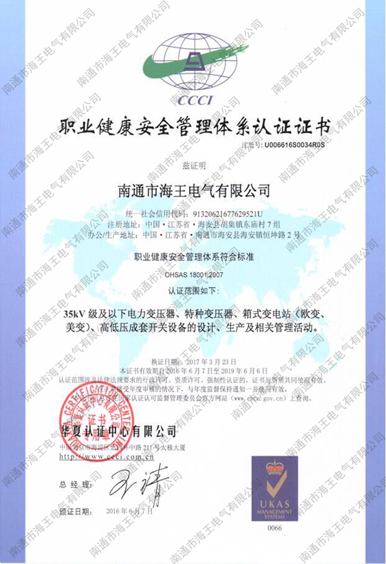 職業(yè)健康安全管理體系認(rèn)證證書
